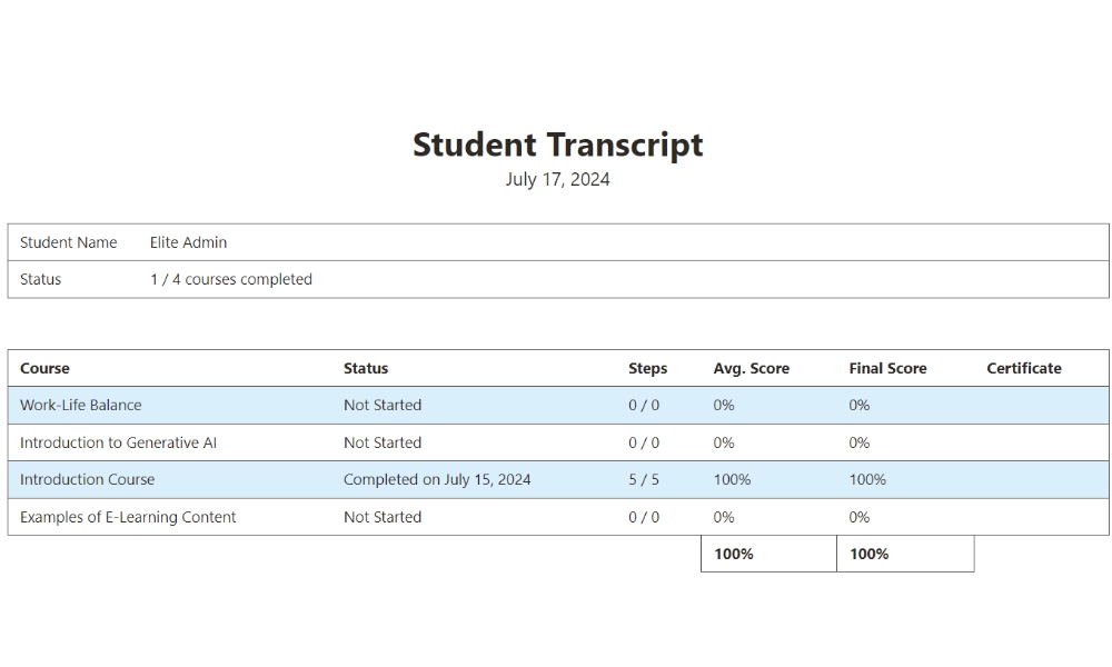 Comprehensive record of a learner's completed courses, grades, and achievements in one place.
